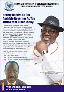 The Vice Chancellor Professor, J.S Oboreh, Delta State University of Science and Technology, ozoro, Congratulates His Excellency, the Executive Governor, Delta State, Rt.Hon.(Elder) Sheriff Francis Orohvwedor Oborevwori, as he turns a year older today.