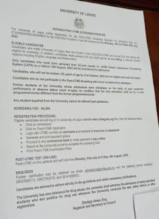 The University of Lagos (UNILAG) hereby invites candidates who choose the University as their First Choice in the 2023 Unified Tertiary Matriculation Examination (UTME) and obtained a minimum score of 200, to apply for Post-UTME Screening Exercise for admission into the University. Also read below other mandatory application eligibility requirements.