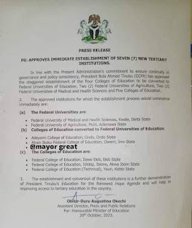 In a groundbreaking move, President Bola Tinubu, the visionary leader of Nigeria, has spearheaded the approval and establishment of these seven new tertiary institutions. His commitment to education, regional development, and the welfare of the Nigerian people has been a driving force behind this historic decision.